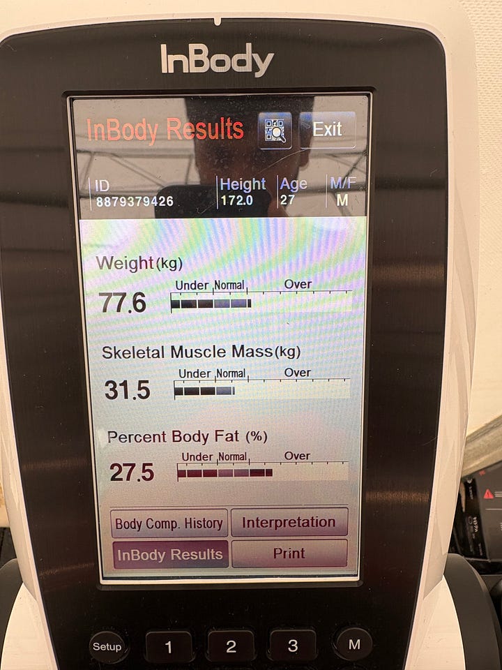 Weight measuring (77kgs, 27.5% body fat)