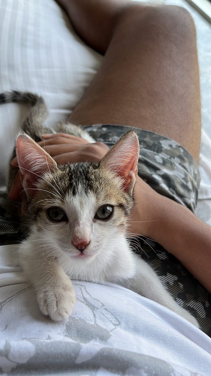 Adopted a smol catto: One day before getting injured, my girlfriend found an abandoned small cat in the society and felt really upset and wanted to adopt him. Sadly, her parents didn’t let her and shockingly my mom felt bad for the kitten and decided that its okay to get him home. And soooo we suddenly had a new family member in the house. We named him ‘Modak’ because its a running joke between me and my girlfriend where we name cats on Indian food items like Poha and Misal.